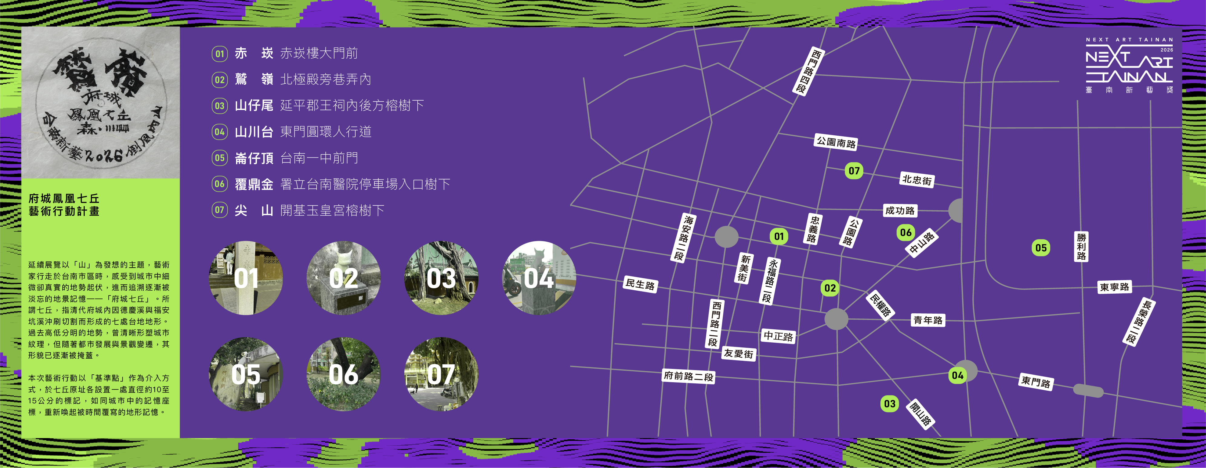 延續本次展覽以「山」為發想的主題,藝術家在行走於台南市區時,感受到城市中微妙卻真實存在的地勢起伏。這些高低變化,指向一段逐漸被淡忘的地景記憶——〈府城七丘〉。